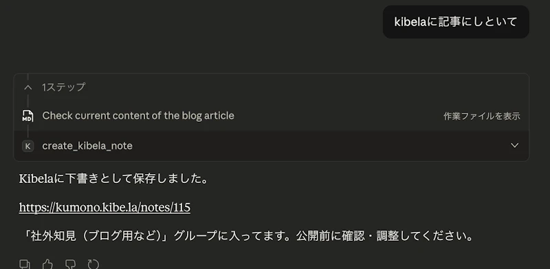 「社外向けのブログ記事を書きたい」と伝えて、Claudeが既存のKibela記事を読んで文脈を把握して、ドラフトを提案してもらって、方向性を調整して仕上げる。