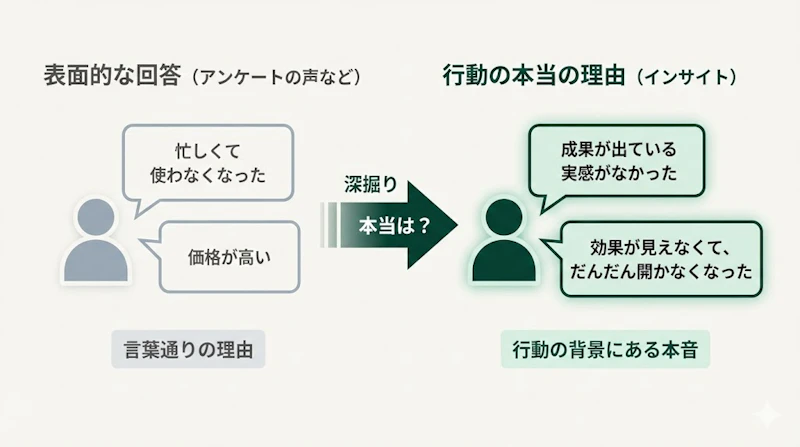 「忙しい」は表面的な理由で、本当は「成果が実感できなかった」が行動の理由だったということになります。この時、「行動の本当の理由」が顧客インサイトにあたります。
