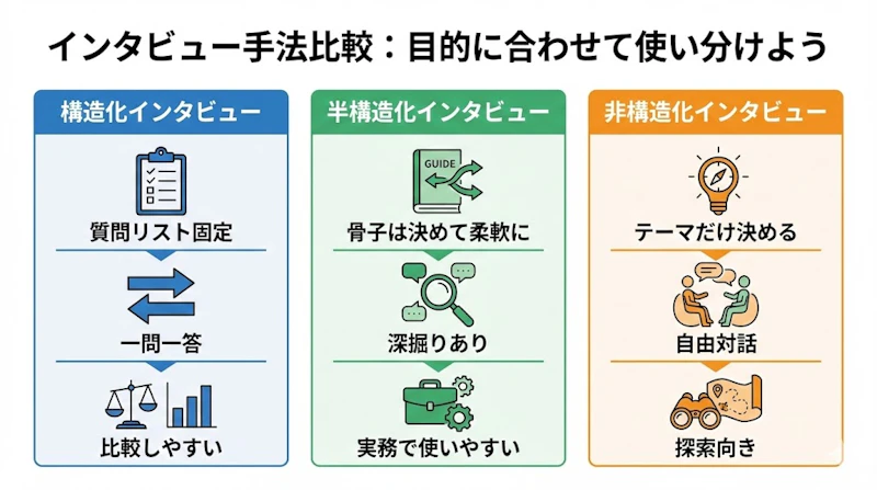 インタビューの形式は大きく3つに分かれます。事前に決めた質問を一問一答で進める「構造化インタビュー」、質問の骨子は決めておきつつ話の流れで柔軟に深掘りする「半構造化インタビュー」、テーマだけ決めて自由に対話する「非構造化インタビュー」です。