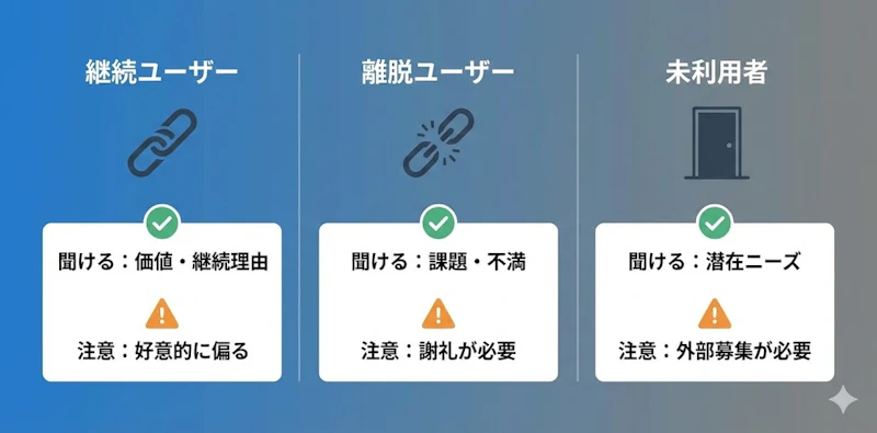 既存ユーザー(継続中):サービスの価値や継続理由を聞きやすい。ただし好意的な声に偏りやすく、改善点が出てきにくい傾向があります。
