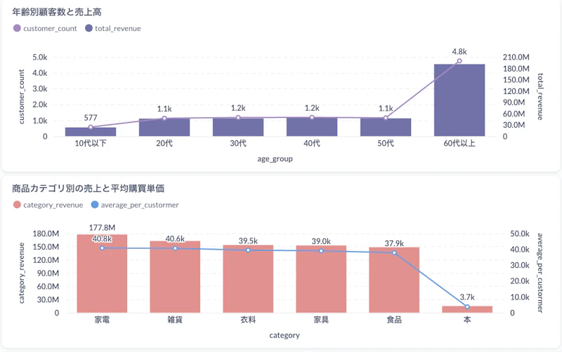 - 例(下):商品カテゴリ別の売上が棒グラフ、商品カテゴリ別の平均購買単価が折線に