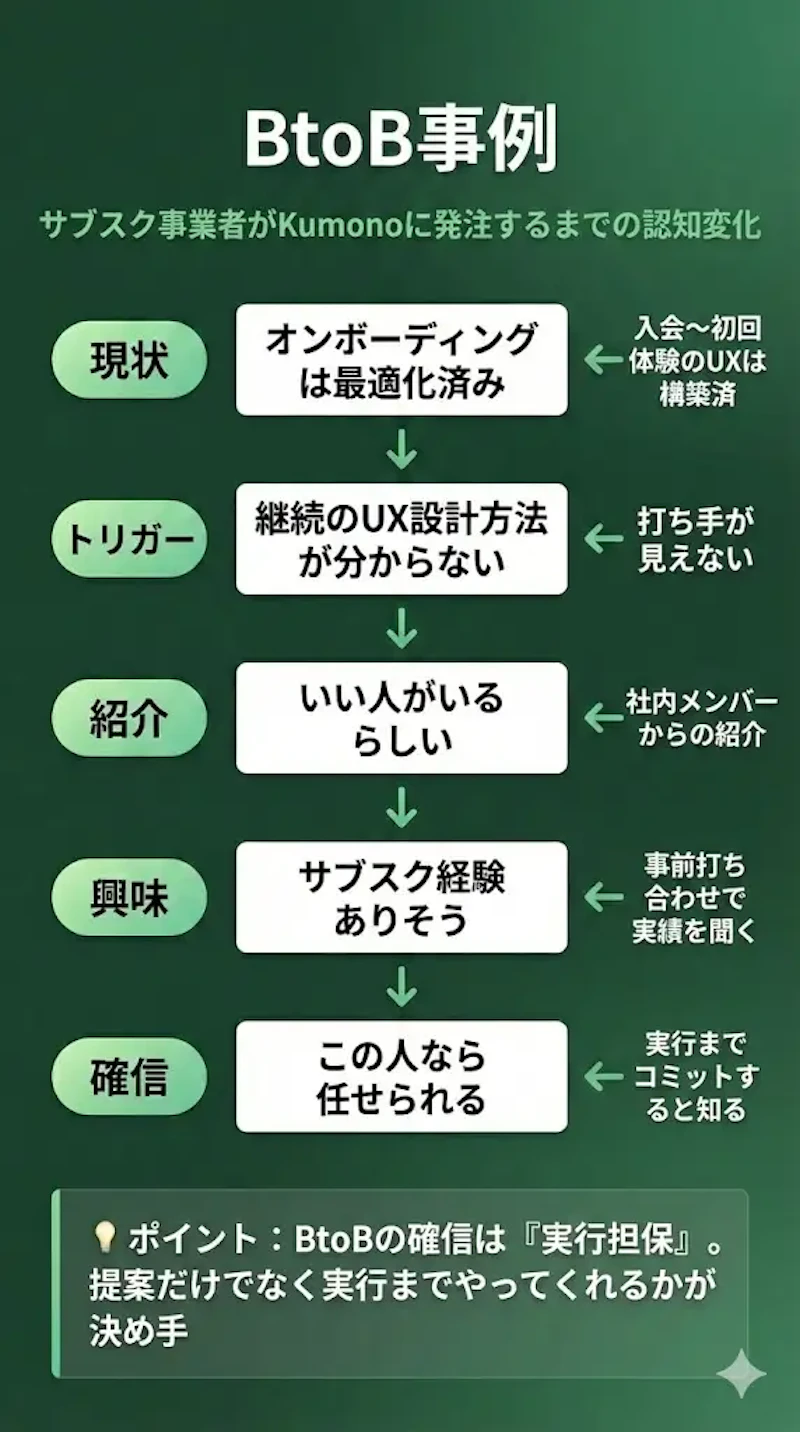 次にBtoBの例として、「サブスク事業を運営する会社がKumonoに発注するまでの認知変化」を整理してみました。
