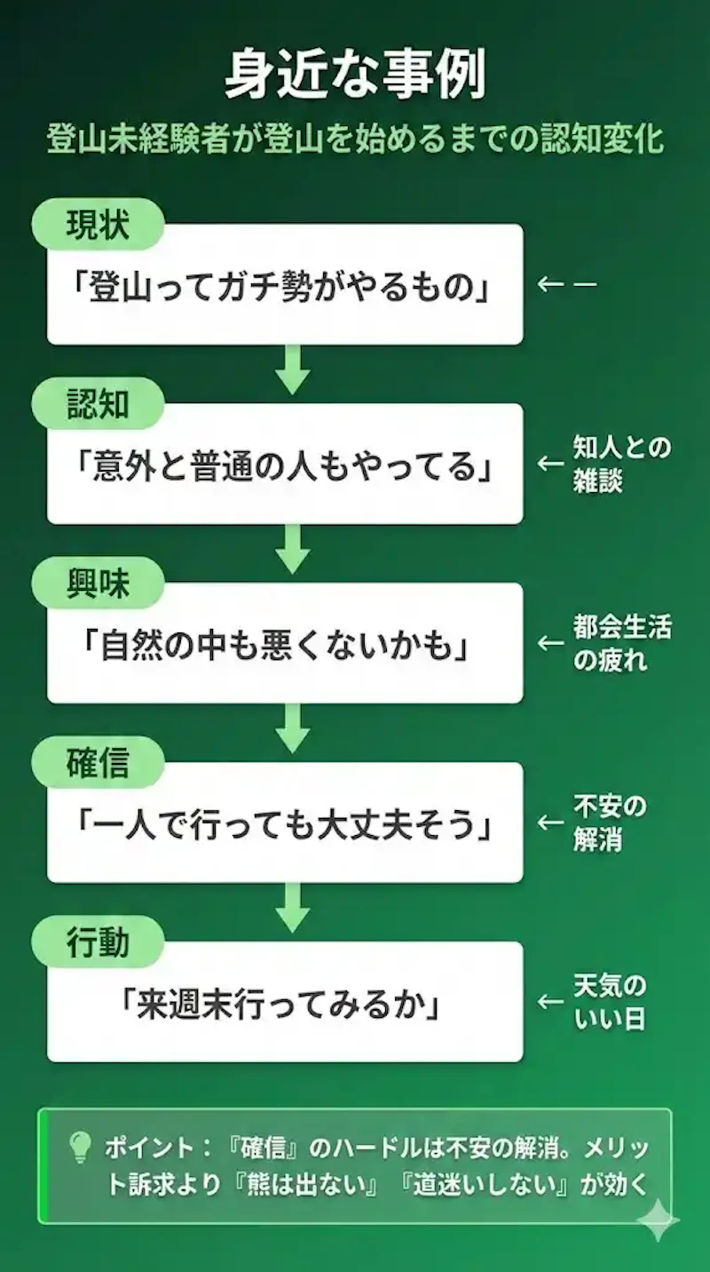 ここからは具体例で見ていきます。まずは身近な例として、「登山未経験者が登山を始めるまでの認知変化」を整理してみました。