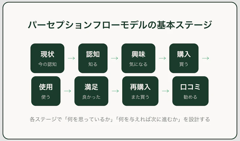 パーセプションフローモデルは、顧客の「認知変化」を軸にマーケティング活動を設計するフレームワークです。