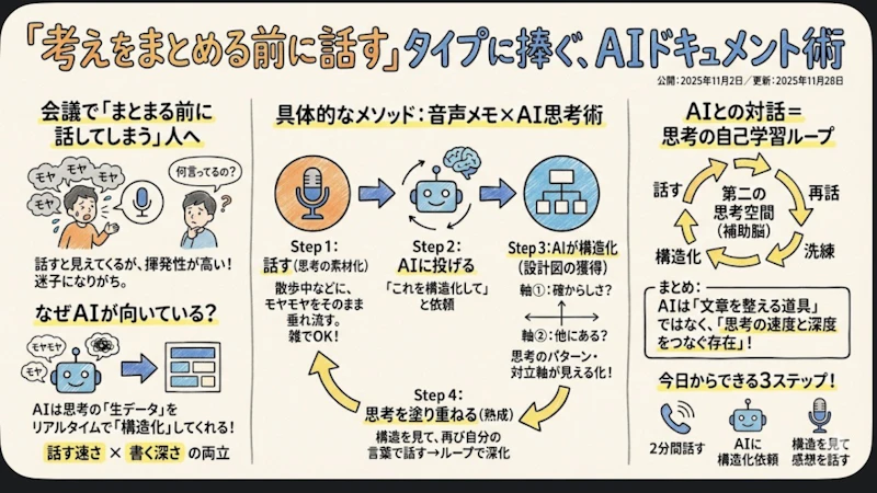 音声メモをAIに渡して構造化させることで、考えながら話す人の揮発的な思考をドキュメントとして育てる方法を解説する。